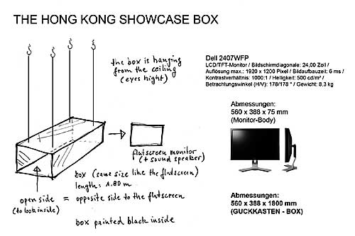 "The Hong Kong Showcase Box" ist ein frei im Raum hängender Guckkasten. Auf dem darin eingebauten Flatscreen-Monitor läuft der Film "The Hong Kong Showcase" als Loop. Traditionell handelt es sich bei einem Guckkasten um eine Vorrichtung zur Erzeugung optischer Illusionen bzw. zur Intensivierung visueller Eindrücke. Dadurch, dass das Bild sich in einem dunklen Umfeld befindet und auf dem Flatscreen von innen beleuchtet ist, wird die Raumwahrnehmung wesentlich verstärkt. Auch der Ton gewinnt durch die besondere Akustik der Box an Intensität. So potenziert die Installation die beabsichtigt-sinnliche Raum-Zeit-Wirkung: “Die Welt ist alles, was der Fall ist." (Ludwig Wittgenstein, Tractatus logico-philosophicus, Satz 1). The Showcase: eine Fallstudie, und der Guckkasten: ein Schaufenster zur mondialisierten Welt.