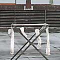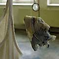 Hackfleisch in Papier genäht, mit weißem Gummiband an selbstgeschweißtem Metallständer.