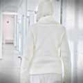 Latexhandschuh, ohne Finger, mit Haaren gefüllt, Trägerhemd mit Haarstoppeln.