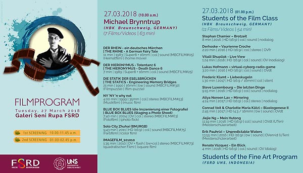 Michael Brynntrup is an artist and filmmaker, and has been Professor of the Film Class at the Braunschweig University of Art (HBK) for over ten years now. The regular program of study takes four to five years, and features a mixed group of both new and experienced students. After achieving an MA (Diplom), the most advanced students may stay for an additional year of Masterclass (so-called Meisterschüler). - The four film programs bring together several films by Prof. Brynntrup (from a period spanning more than thirty years). An additional program presents recent works by current students of the 'Filmklasse Braunschweig'.