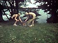 Totentanz 6 returns out of doors. Shot in a high weeded field, a gnome-like figure picks his way through a flourishing vegetable life until arriving at the ubiquitous skull, now covered over with swarming flies. He rubs his face against it in a gesture of sympathy, replaces an eye, and picks out the bloody entrails which remain in its cavities. Obsessively he begins to clean it, to try to restore it to a pure skeletal state, to separate it from its life as meat, but is unable to do so. Frightened, he flees, the skull now reappearing in a crimson overlay haunting his departure, threatening his every movement. Forced to return, he forms a kind of flesh altar around the skull, acceding to its demand to partake of this world and the next, before clambering up a nearby tree and waiting, frozen against the afternoon sky.